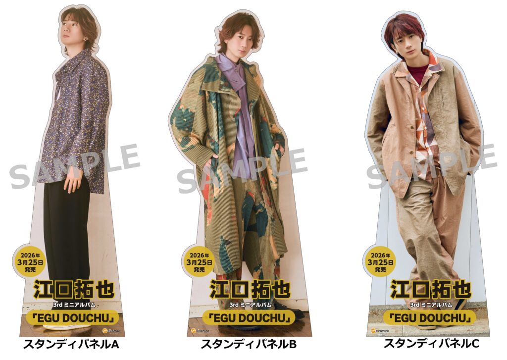 全3種類のスタンディパネルを各店舗で掲示しますので、お近くの店舗にどの江口拓也がいるか、チェックしに行ってくださいね!